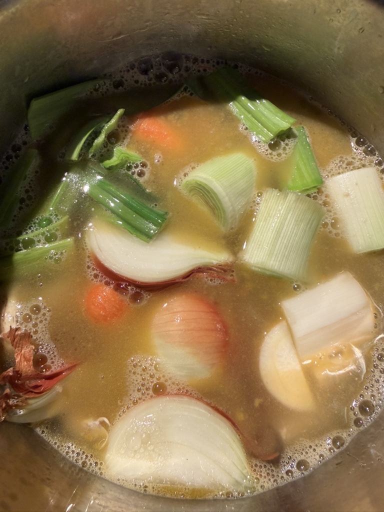 Dann folgen das Gemüse und Wasser gemäß der Mengenangabe am Ende des Rezeptes. Salzen darf man Brühen erst einmal nicht.