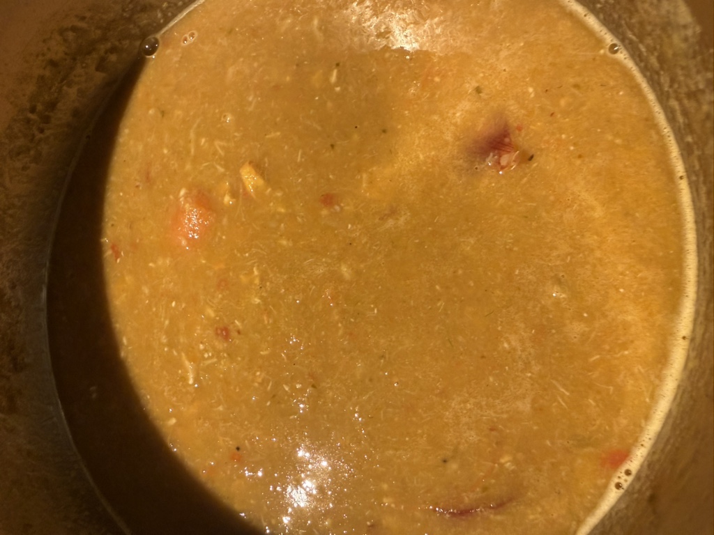 So lässt man das eine Stunde sanft köcheln. Man könnte die Brühe dann abgießen, für noch deutlich mehr Geschmacksextraktion pürieren wir sie aber grob mit dem Stabmixer…