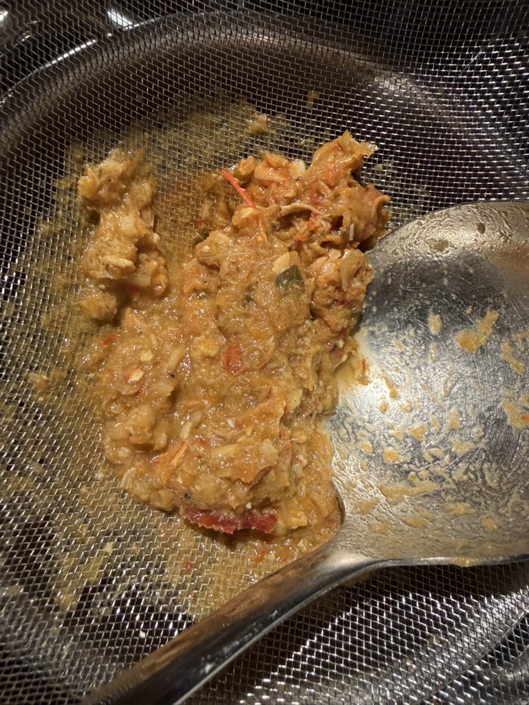…bevor wir sie durch ein feines Sieb streichen, um insbesondere die Reste der Köpfe und Schalen zu entfernen. Wir empfehlen diesen zusätzlichen Schritt sehr.