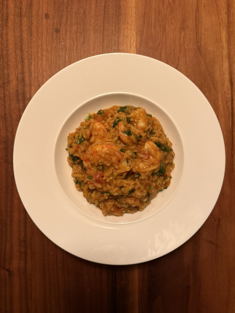 Der Reis sollte jetzt noch nicht ganz gar und fest im Kern sein. Nun kann final mit Salz abgeschmeckt werden. Dann kommen die Garnelen zurück in den Topf und alles wird für weitere 5 Minuten sanft gesimmert, bis der Reis die perfekte Konsistenz hat – cremig aber noch mit ein wenig Biss. Wer möchte, gibt nun weitere Flüssigkeit hinzu.