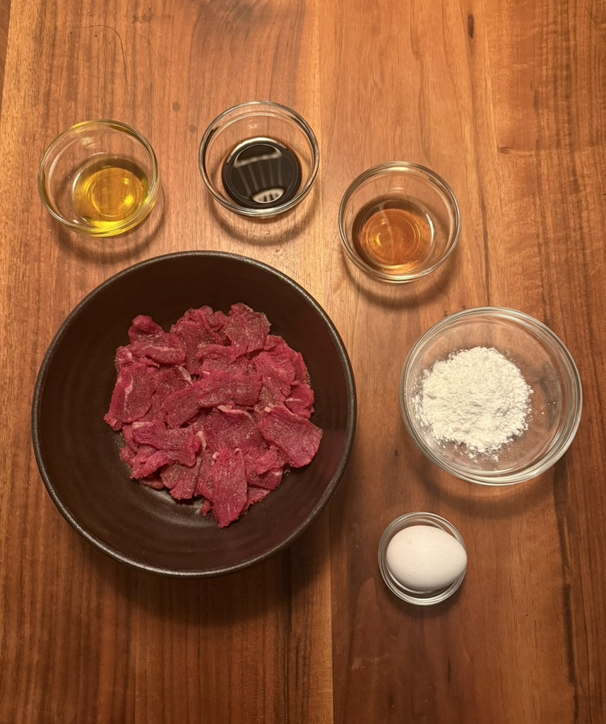 Das Fleisch muss von einem Stück sein, das sich zum zarten Kurzbraten eignet. Wir verwenden hier Rinderfilet. Es wird in 3 mm dünne Streifen geschnitten, und zwar gegen die Faser. Dann wird das Rindfleisch mit ein wenig neutralem Öl, Sojasauce, chinesischem Kochwein, Speisestärke und Ei gründlich vermengt, so dass es ganz mit einer milchig-weißen Schicht überzogen ist.