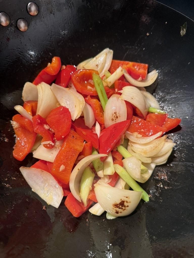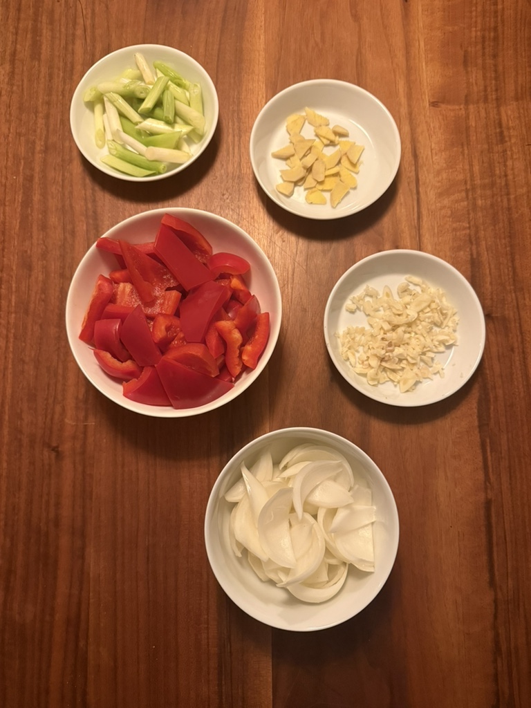 Knoblauch und Ingwer werden geschält und grob gehackt oder in feine Scheiben geschnitten, man soll sie später herausschmecken können. Frühlingszwiebeln und Zwiebel werden in größere Stücke oder Streifen geschnitten, auch sie sollen einzeln mit Stäbchen greifbar sein. Rote Paprika ist das letzte Gemüse, das ebenfalls in Streifen geschnitten wird.