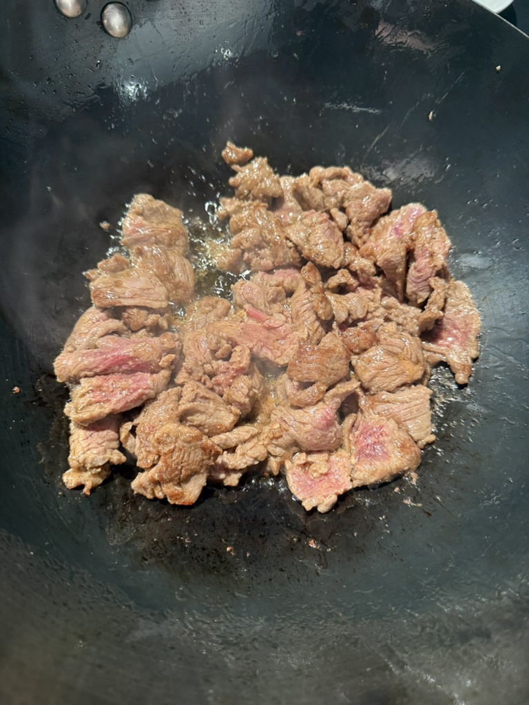Die Zubereitung ist so einfach und schnell, wie das bei Gerichten aus dem Wok fast immer der Fall ist. Wenig neutrales Öl wird sehr hoch erhitzt und das Fleisch wird für nur 30 Sekunden unter ständigem Rühren scharf angebraten. Es soll Farbe annehmen, denn das ist Geschmack. Es muss aber auch noch Rosa durchscheinen. Sofort wird das Fleisch aus dem Wok genommen und auf einem kalten Teller ausgebreitet, damit es nicht in der Resthitze weitergart.