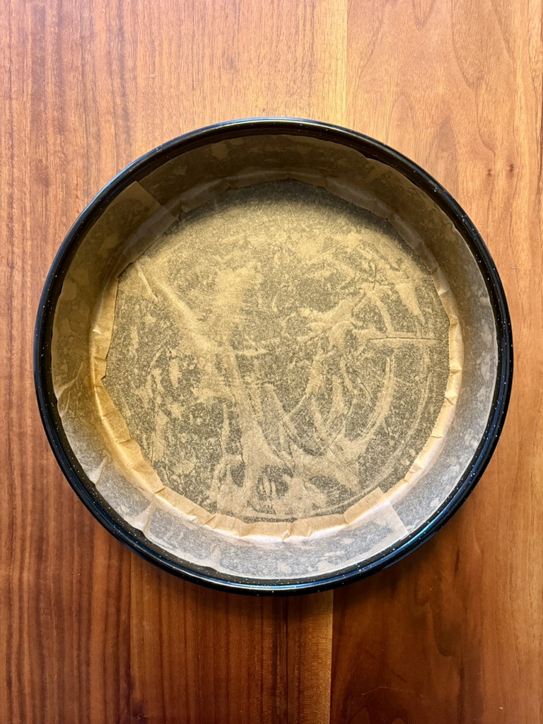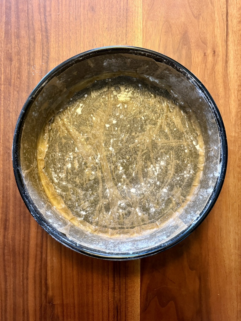 Wir verwenden eine runde Backform mit einem Durchmesser von 30 cm. Das kann eine Springform sein, unsere besteht aus einem festen Ring und einem Boden, der von oben eingelegt und später herausgehoben werden kann. Die Form wird leicht mit Butter eingefettet und dann äußerst sorgfältig mit Backpapier ausgekleidet, das wegen der Butter an der Form haftet. Wie man das Backpapier zuschneidet, wird hier gezeigt.