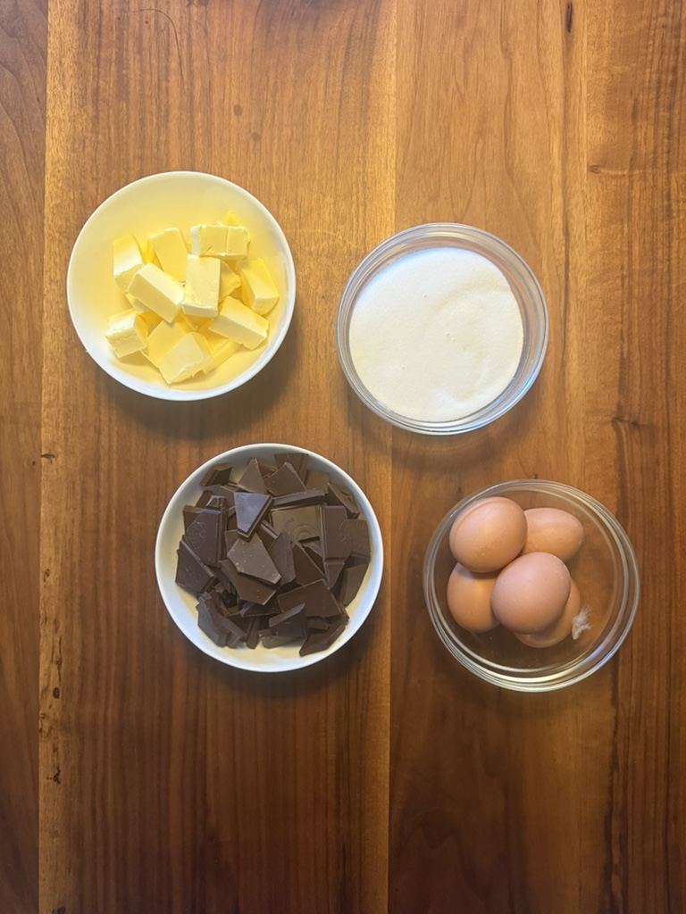 Während die Butter-Schokoladen-Mischung abkühlt, kann man den Ofen vorheizen. Im ersten Rezept wurde eine hohe Hitze von 160 Grad Celsius bei einer kurzen Backzeit von nur 30 Minuten angegeben. Das haben wir ausprobiert und man erhält ein äußerst delikates Ergebnis mit einer dünnen Kruste und einem feucht-mousse-artigen Inneren, fast wie bei einem Soufflé. Das schmeckt großartig, ist aber äußerst schwer zu servieren.
