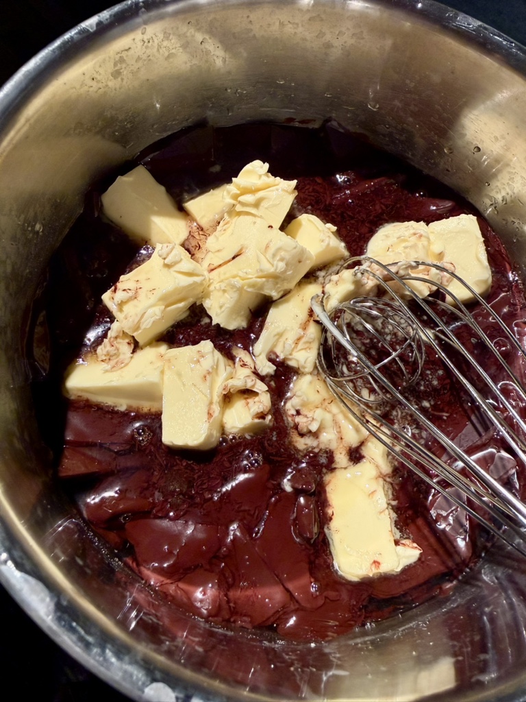 Der restliche Zucker wird in einem Topf mit etwas Wasser auf mittelhoher Stufe so weit erhitzt, dass der Zucker sich völlig im Wasser auflöst. Wir unterstützen das, indem wir mit einem Schneebesen rühren. Dann werden die sämtliche Butter und Schokolade in dem Sirup geschmolzen und homogen verrührt.