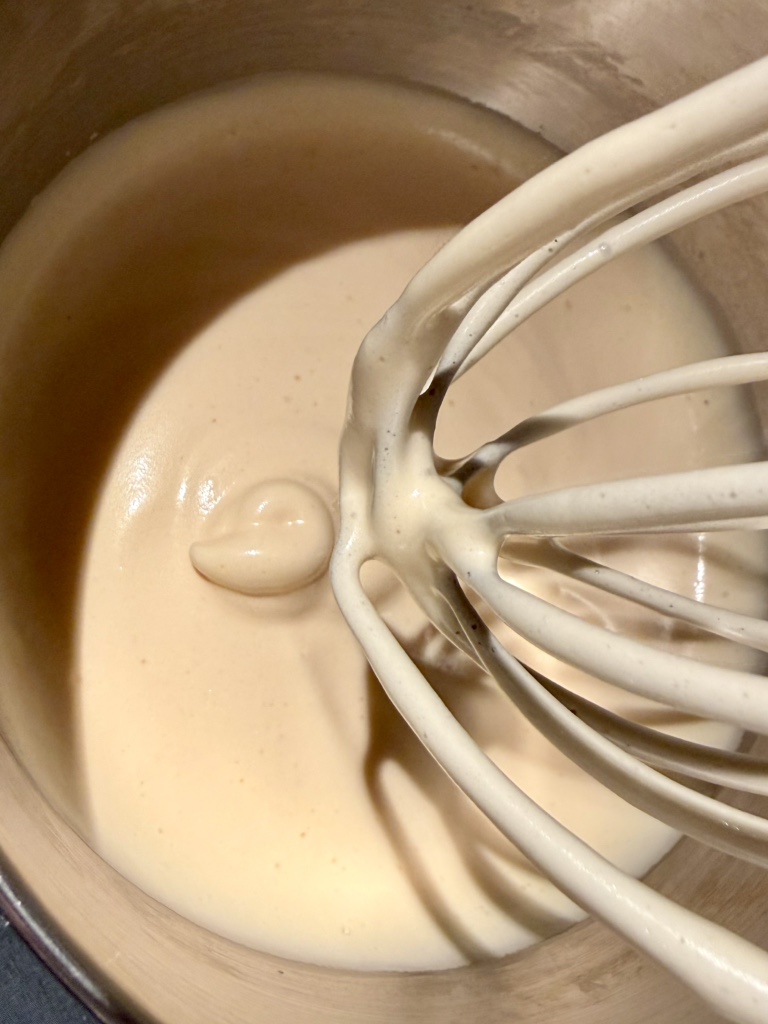 Diese sehr heiße Mischung muss nun etwas abkühlen, wir nehmen also den Topf von der Hitze und geben ihr dafür 15 Minuten Zeit. Dann wird diese Mischung in den Kessel zu der schaumigen Ei-Zucker-Masse gegeben. Das machen wir vorsichtig mit dem Schneebesen, nicht mit der Maschine. Es darf nun auch nicht mehr lange gerührt werden, die Masse soll luftig bleiben. Wir verbinden also alles nur gerade so lange, dass eine farblich einheitliche Mischung entstanden ist.