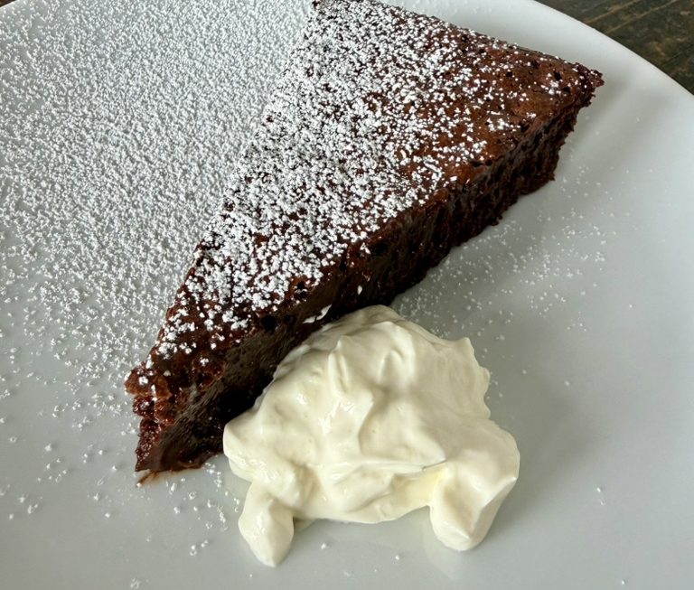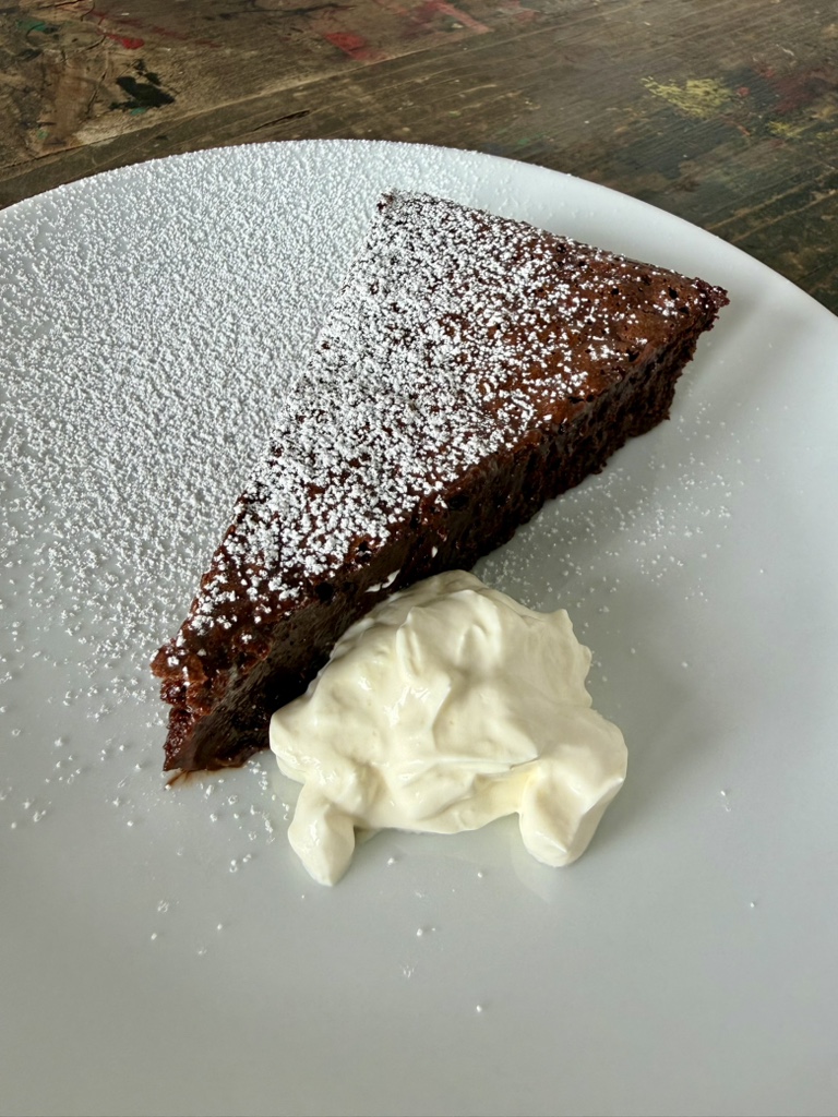 Ein späteres Rezept des River Café sieht eine viel geringere Temperatur von nur 120 Grad Celsius vor (immer ohne Umluft). Dafür soll die Backzeit nun 1,5 – 2 Stunden betragen. Bei unserem Ofen sind 1 Stunde und 45 Minuten bei dieser Temperatur die perfekte Zeit und wir empfehlen, mit der längeren Zeit bei niedrigerer Temperatur zu backen. Der Kuchen ist fertig, wann man die Hand auf die Oberfläche legen kann und diese trocken ist und auf vorsichtigen Druck nicht einsinkt. Das Innere ist dann immer noch sehr feucht, wie eine Ganache.