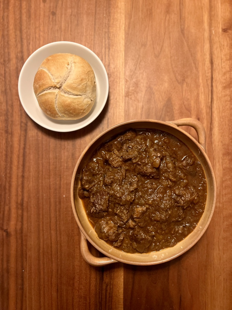 The key ingredients are meat (in our case: beef) and onions. The ideal piece of meat when choosing beef is the calf, but you can also use other cuts that are suitable for stews. It is important that it is rather long-fibered and rich in connective tissue – the meat that would quickly become tough when pan-fried.