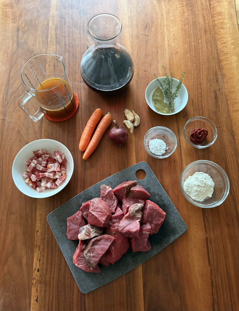 For the vegetables, you need to use onions, carrots and garlic. To make the sauce, you will further need icing sugar, tomato paste, flour, red wine (Pinot Noir, of course) and beef stock.