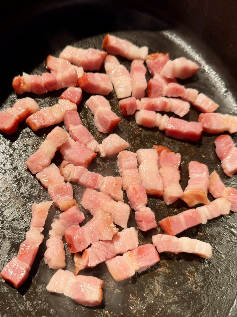Place a large, heavy roasting pan over medium-high heat and add the lardons. There is no need to add any additional fat. Fry the bacon until it begins to lightly brown. Then immediately remove it from the pan and set it aside.