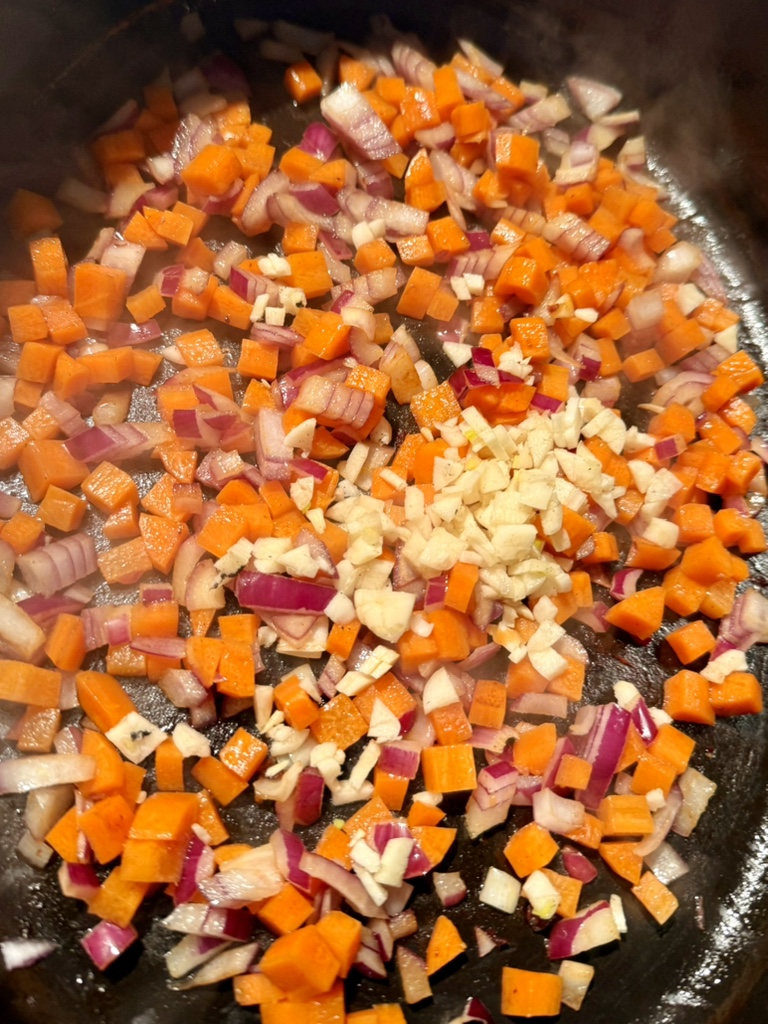Peel and finely dice carrot, onion and garlic. In the same pot, sauté the carrot and onion for 2–3 minutes until the onion becomes translucent. Then add the garlic and sauté until it begins to smell fragrant.