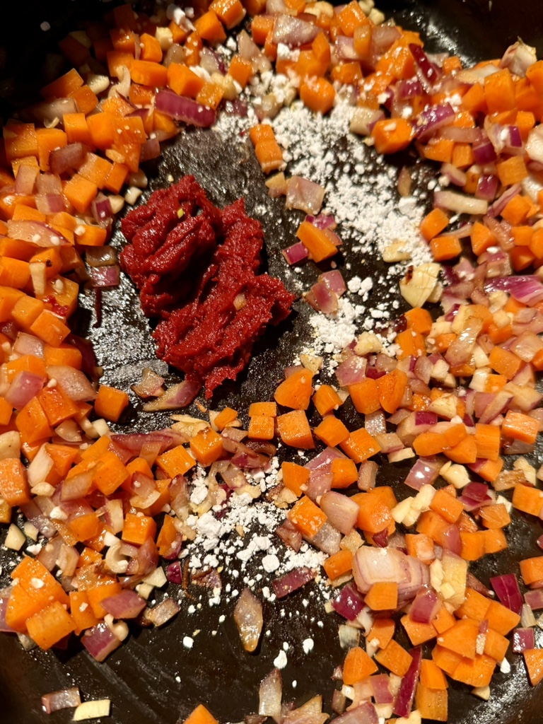 Once again, stir everything thoroughly so that a thick layer of tomato purée, vegetables and flour coats the meat.