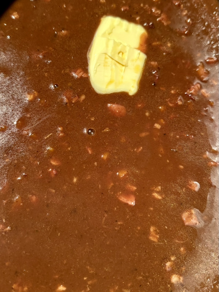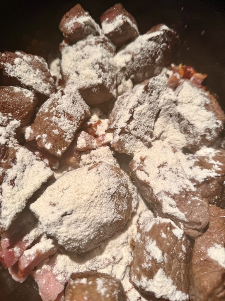 Stir everything together and continue to sauté while the icing sugar melts. Once everything is thoroughly mixed, return the bacon and meat, along with any juices, to the pot and dust everything with a little flour.