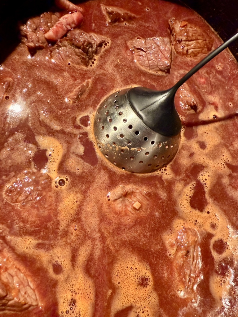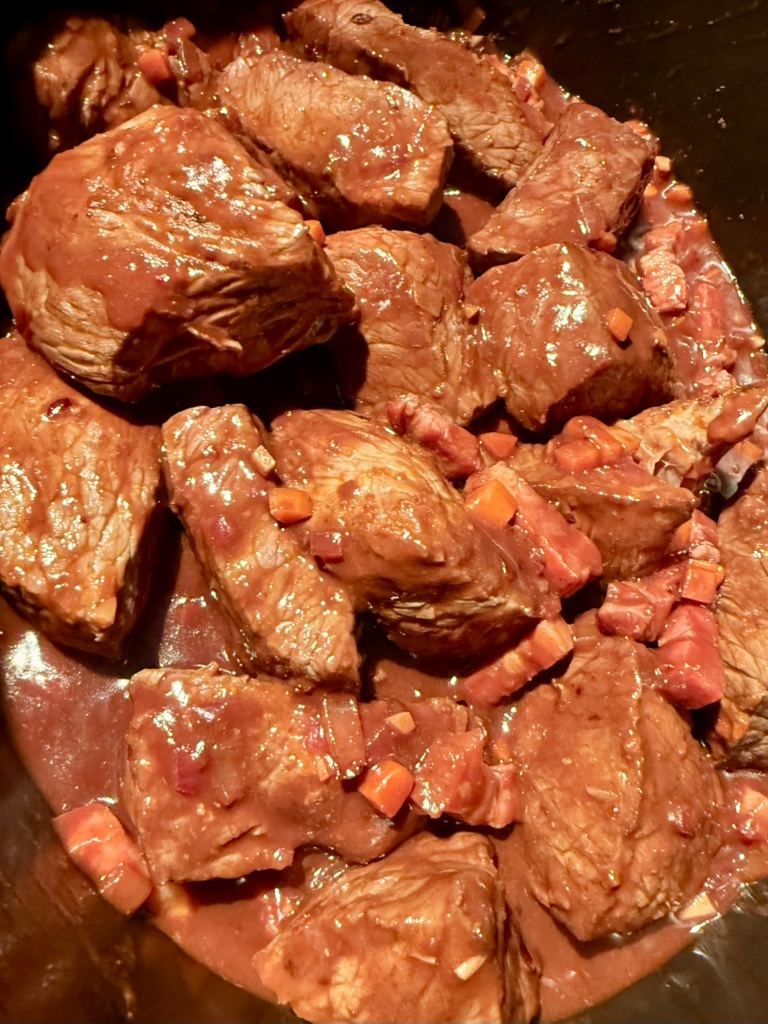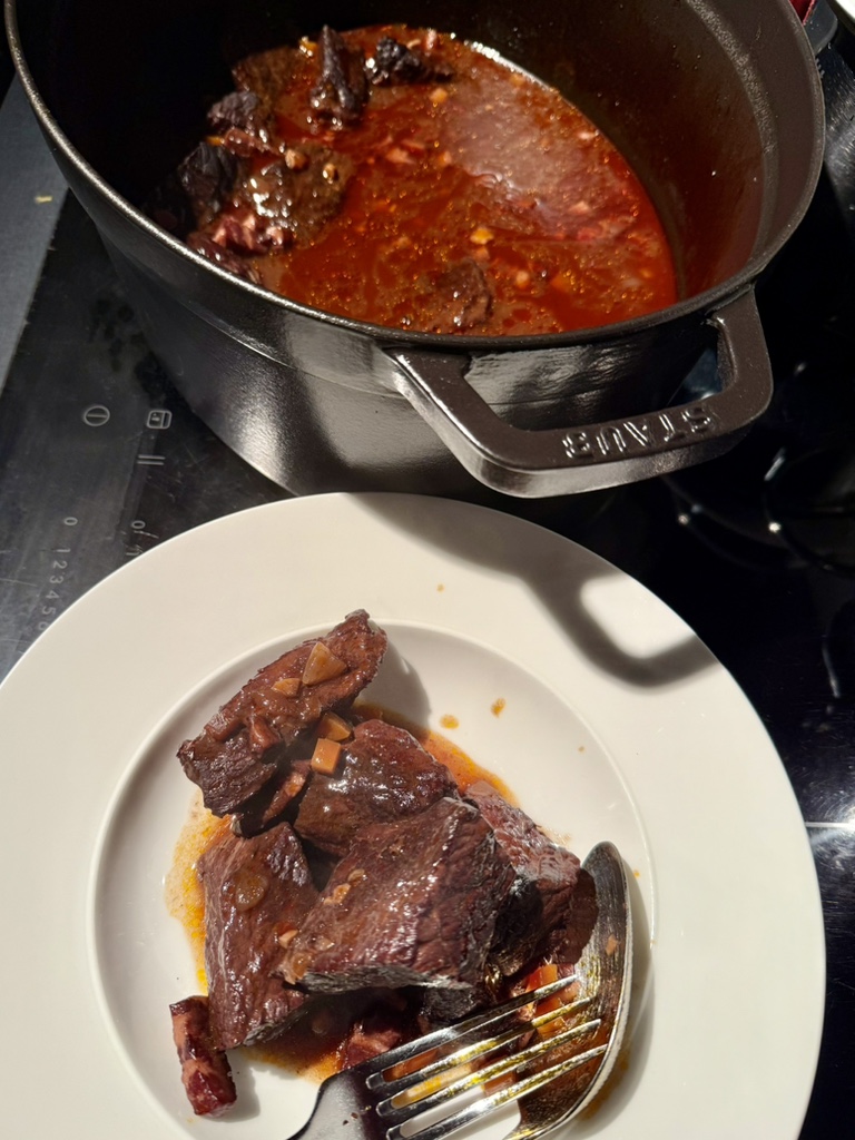 For stews, cuts rich in connective tissue are generally used, which become tender and aromatic when cooked slowly. We have described this, for example, here for Stracotto di Manzo from Italy, here for braised onion roast from Germany, and here for Carbonade Flamande from Belgium.