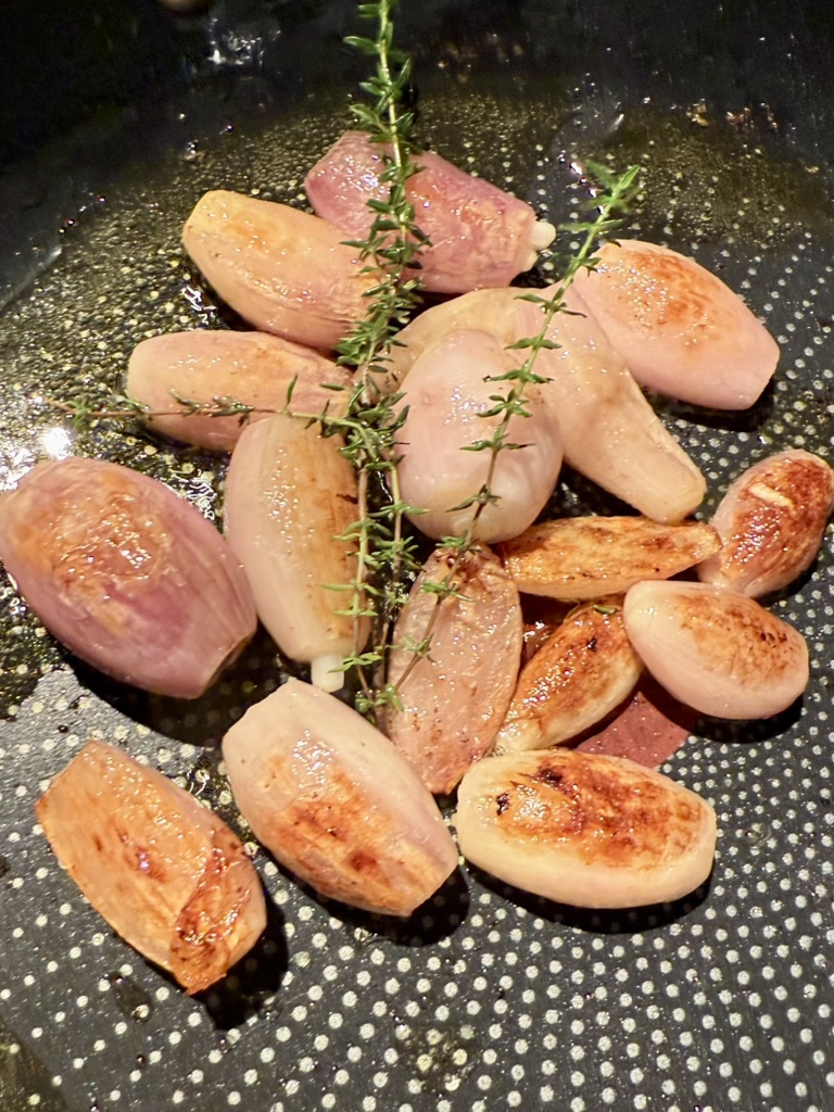 The shallots are peeled carefully so as not to damage their structure, as they are to be braised whole. To do this, heat them in a little clarified butter over a medium heat in a pan and add a little salt and thyme sprigs. We let them brown gently on one side and then turn them over until the other side has also taken on colour. This must be done slowly and the shallots must not be moved too much, otherwise the innermost layers will be squeezed out by the temperature difference and they will lose their shape.