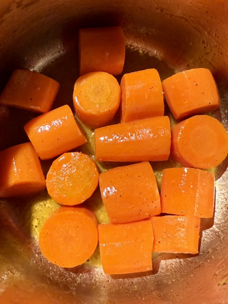 We do a similar thing with carrots: we peel them and cut them into big chunks, which we also want to keep their shape and not get too soft. To do this, we put them in a small pot with a bit of butter, season them with some salt and pepper, and put a lid on. We then place the pot on medium heat (4 out of 10) and cook the carrots for 25–30 minutes, turning them only occasionally.