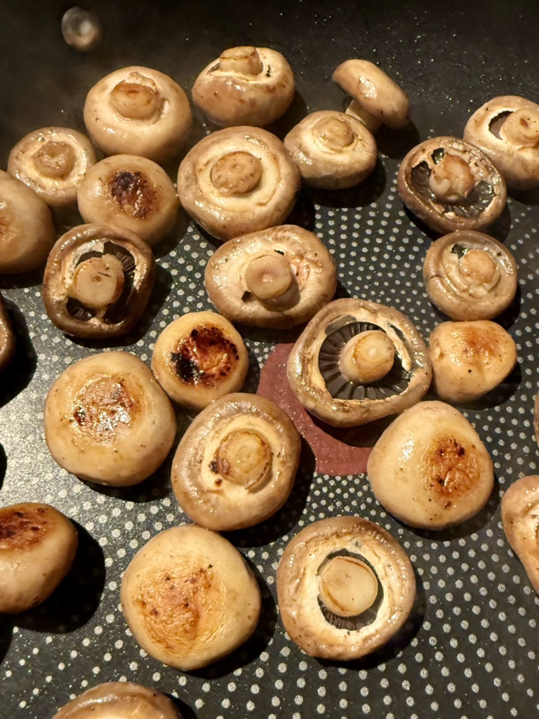 The third and final vegetable is mushrooms. Clean them with kitchen paper and cut off the stalks where they protrude from the mushroom caps. This allows the mushrooms to be evenly sautéed on both sides. First, we do this without adding any fat in a hot pan (8 out of 10) so that the mushrooms brown quickly and lose their liquid.