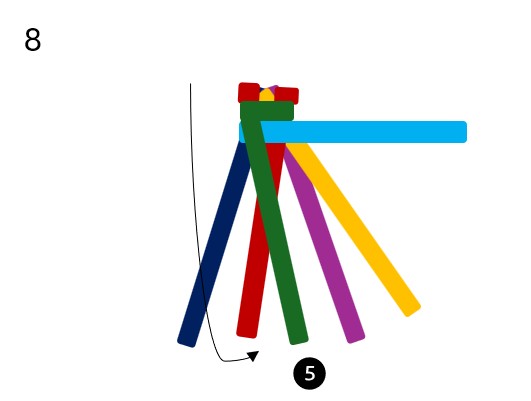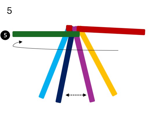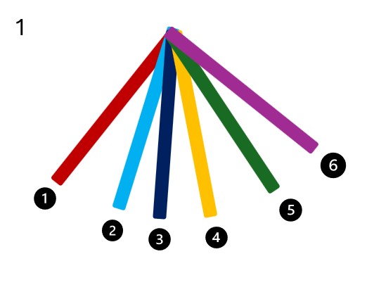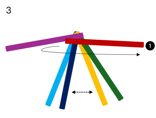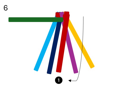 The outermost right strand (No. 6) goes all the way to the left, and the outermost left strand (No. 1) goes all the way to the right. In the middle between 3 and 4, we slightly increase the distance.