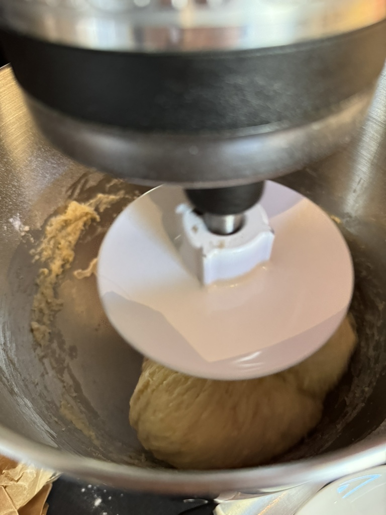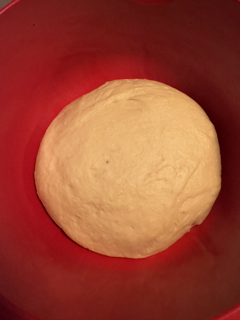 The dough now needs to rise. We let it stand in a covered bowl in a warm place until it has roughly doubled in size.