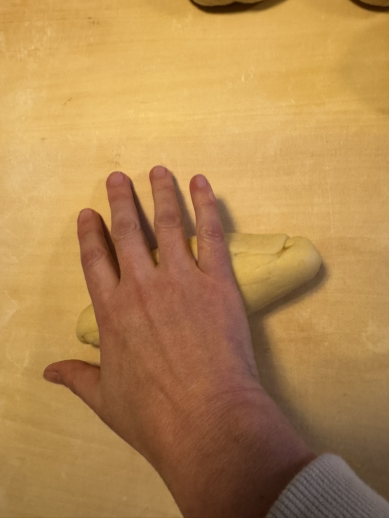 To shape the strands, we first roll the dough into a cylinder. Then we work from the centre using gentle pressure, rolling the dough out into a long shape of 40 – 45 cm, first with one hand, then with both hands. The plait turns out particularly well if the strand is slightly thicker in the middle and slightly thinner at the ends. This works best if you work on a board dusted very lightly with flour. If there is too much flour, the roll will simply slide across the surface; if there is no flour at all, the dough may stick.
