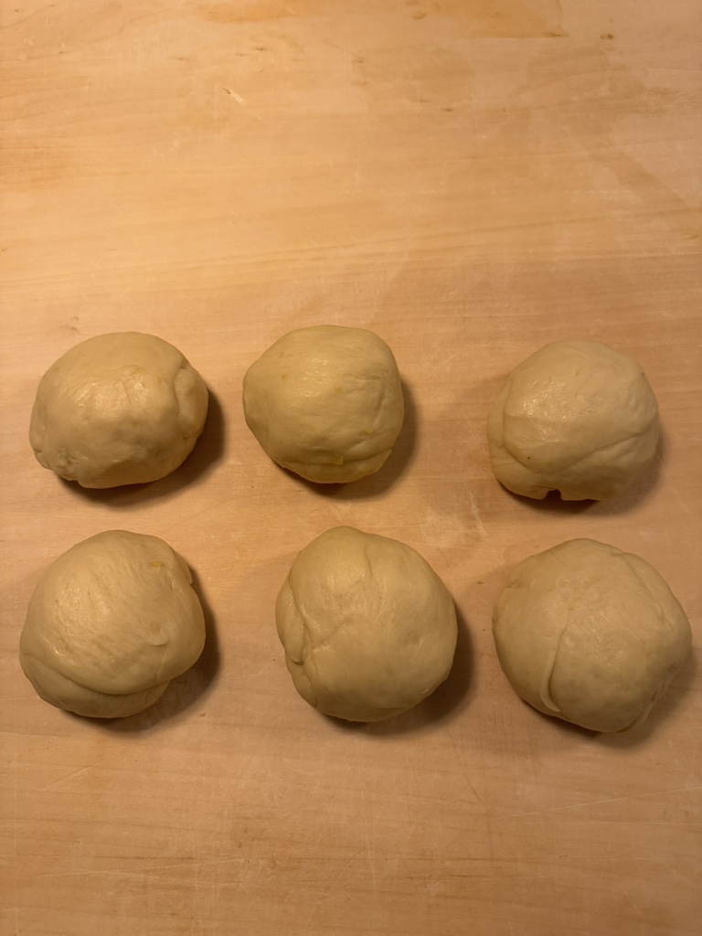 We weigh the dough, divide it into six portions and shape them into simple dumplings.