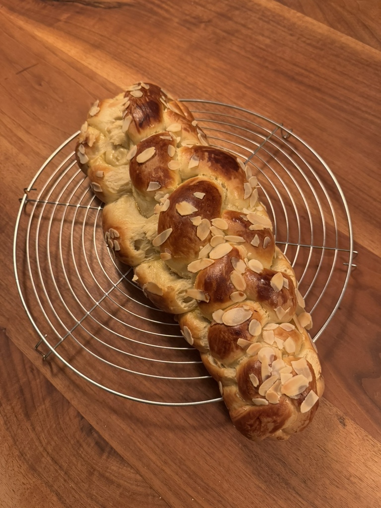 Now carefully place the finished braid onto a baking sheet and let it rest for at least another hour. During this step, it will rise quite a bit again; the air we squeezed out during shaping will be replenished by the yeast, making the braid fuller and more beautiful. Just before baking, brush the braid with egg yolk for a lovely, glossy finish and sprinkle on a few flaked almonds (which is optional).