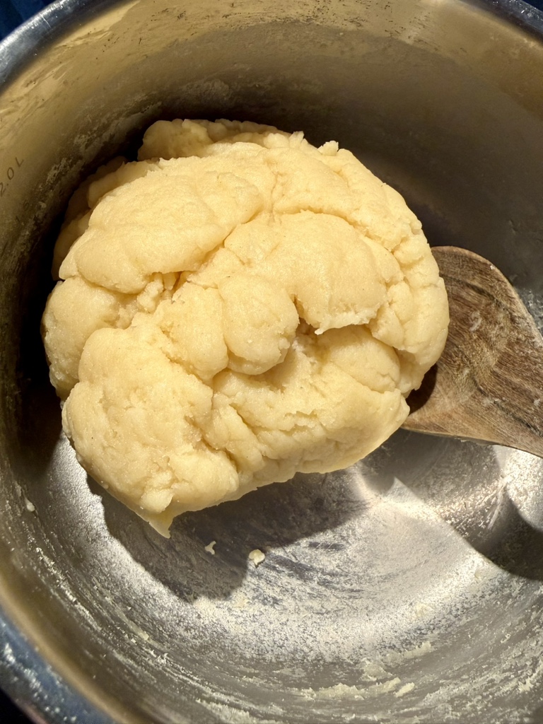 Now turn off the stove – but the dough must still be worked while warm. From this point on, you can use a food processer. Doing it by hand is possible too, but it’s even more work than what you’ve already done. Crack eggs one by one into a separate bowl first, so you can remove any shell if needed. Then add one egg to the dough and stir until fully incorporated. Only once everything has come together do you add the next egg. This process, when done by hand, replaces the gym.