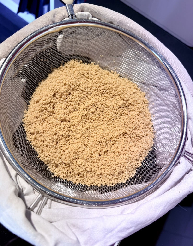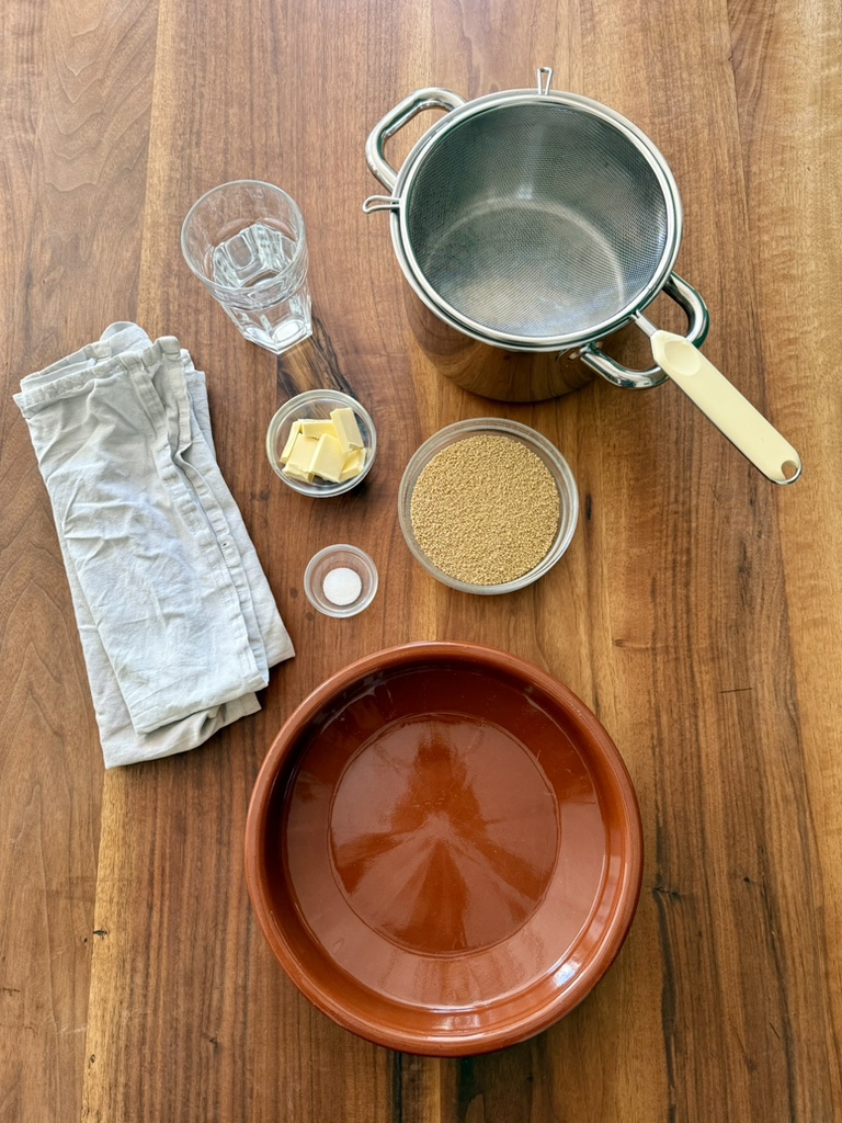 If you don’t have a Couscoussière (like us), you’ll need a fine-mesh sieve and a saucepan that’s just as wide as it is. You’ll also need one or two tea towels and a large bowl. The ingredients are only (instant) couscous, water, salt and butter (Vegans use vegan butter or vegetable oil).