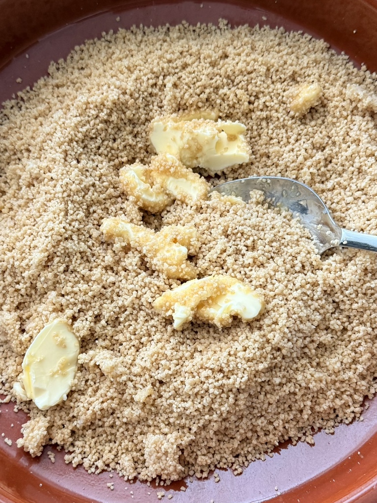 Return the couscous to the bowl, spread it out, and scatter the first portion of butter in small pieces over the hot couscous, then mix until it is completely absorbed.