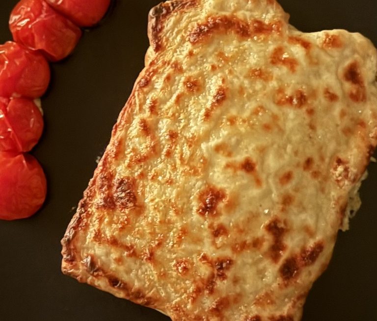 It is then baked in the oven for approx. 15 minutes until golden brown. We like to add small whole tomatoes, which we allow to melt gently.
