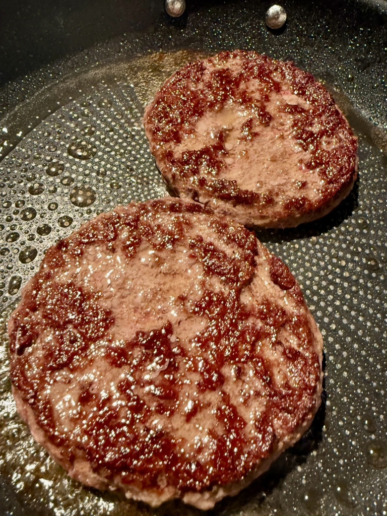 The classic way to make a patty melt is to create a crispy crust: the meat is seared and the bread is toasted in butter. We do both in a pan, first the bread, then the patty. For the meat, we use just a few drops of neutral oil and high heat so that the surface caramelises quickly and thoroughly.