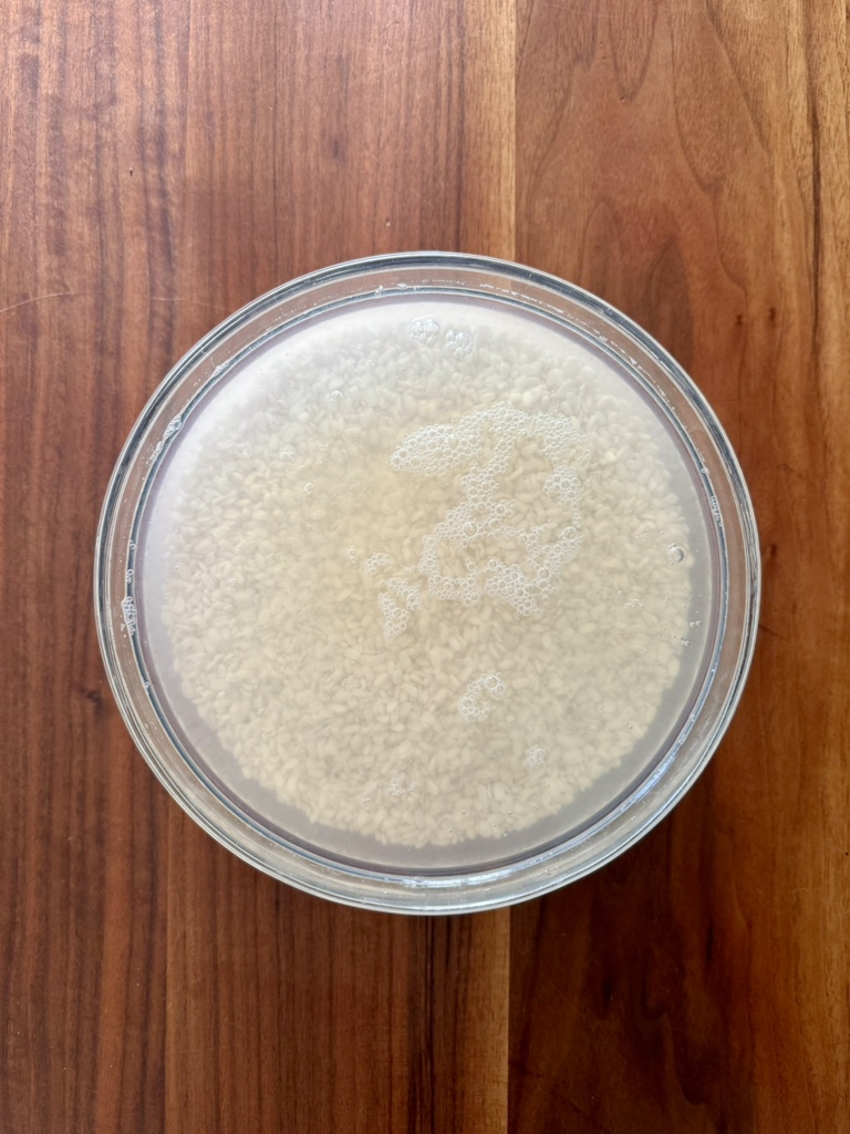 This peeled urad dal must be washed thoroughly. To do this, stir it by hand in a bowl with plenty of water, pour off the milky water, replace it with fresh water, and so on. After about four rounds, the water will remain more or less clear. Then soak the dal in water, which should be two centimetres or more above the beans.