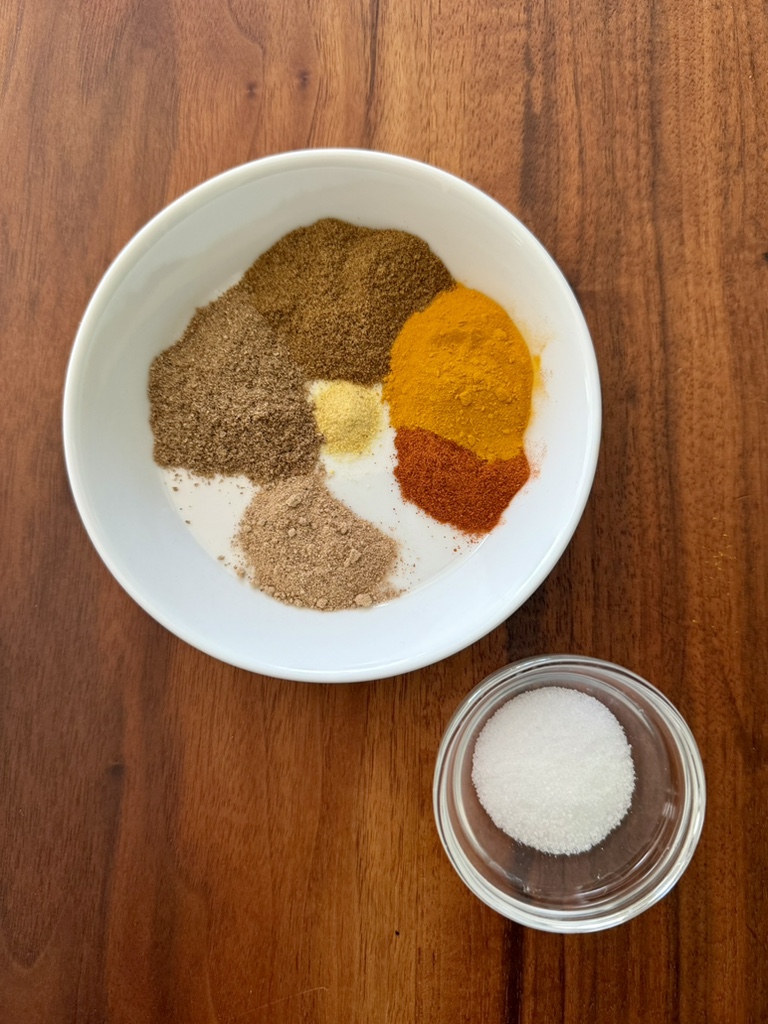 1 teaspoon each of coriander, cumin, turmeric and (Kashmiri) chilli powder
