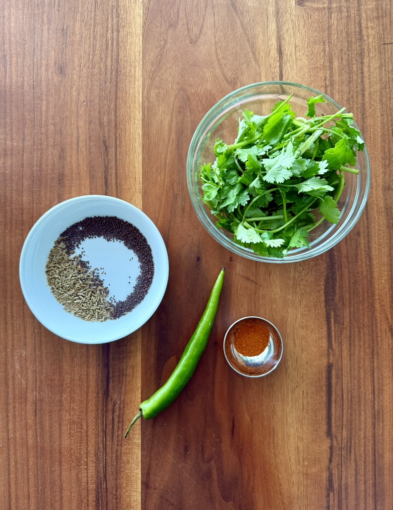 Mustard seeds, cumin seeds and Kashmiri chilli powder should be added to the fat or oil. In India, fresh green chillies are almost always used, roughly chopped and with the seeds left in. We are a little more cautious, removing the seeds and finely dicing the chillies. Fresh coriander is also an essential ingredient in this dal.