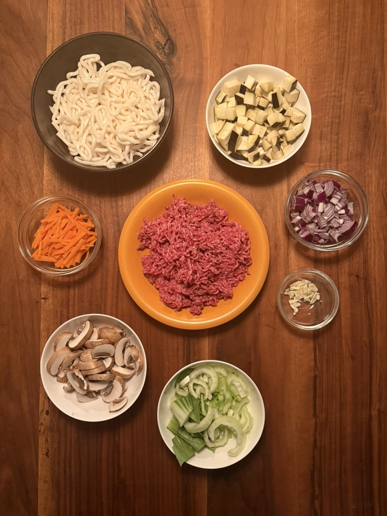 Of course, you can’t do without udon noodles. You can buy them pre-cooked with a long shelf life, otherwise you have to cook dry ones. We also use minced beef, but proteins such as those used in yakisoba would be just as traditional. Onions and garlic are essential, and we also cook with carrots (finely sliced), pak choi and mushrooms (roughly chopped) and aubergine (diced). Use whatever you like or whatever is in season, just make sure you cook each ingredient to its individual cooking point.