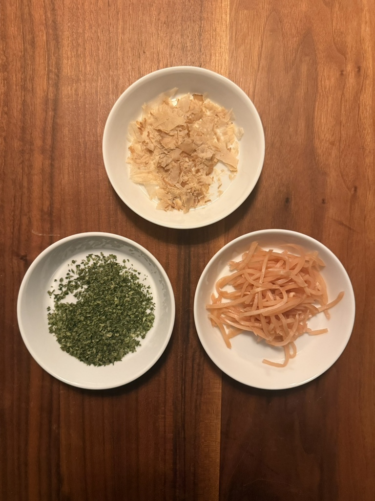 Now all that remains is to mix everything together well and heat it up; there is no more cooking to do. Then we serve in pre-warmed bowls and sprinkle with our seasonings: katsuobushi, aonori and benishoga.