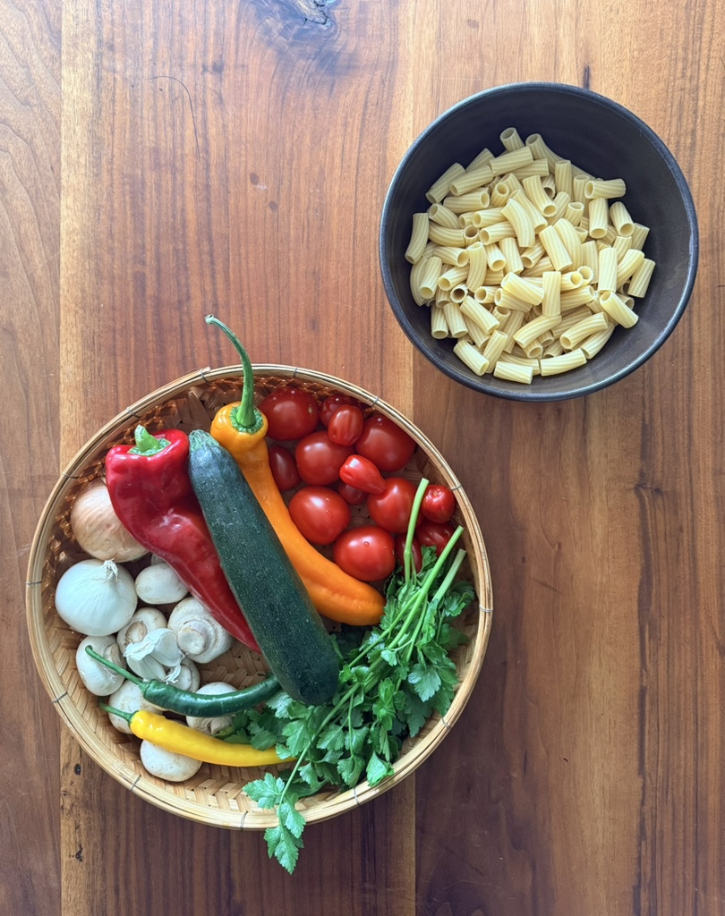 Short tube-shaped pasta works best; today we are using tortiglioni.