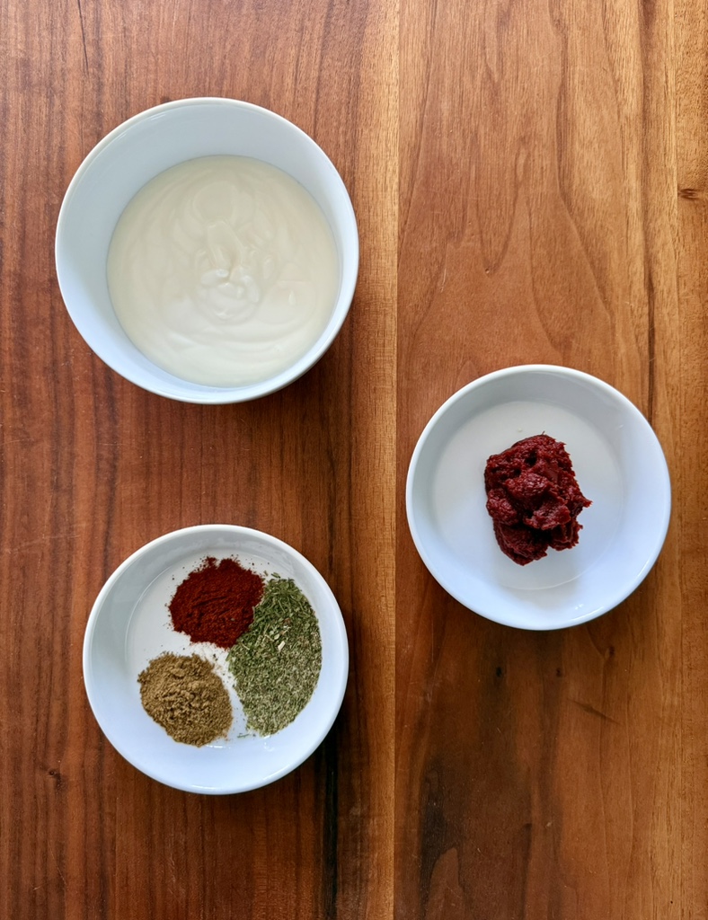 Yoghurt is an essential part of this dish. Another typical Turkish ingredient is salça, a concentrated paste made from tomatoes and/or peppers. We like a mixture of both (karışık salça) and buy it ready-made in jars. Note: salça is also available in a spicier version (acı), with a little chilli added.