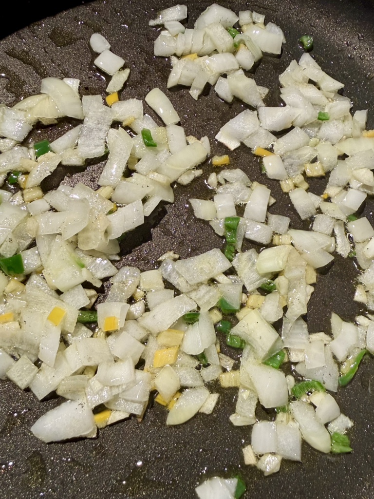 The noodles are pre-cooked, but should still be al dente. Chopped onion and garlic, as well as fresh chilli to taste, are sautéed in a little olive oil over medium heat until translucent.