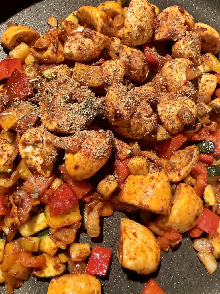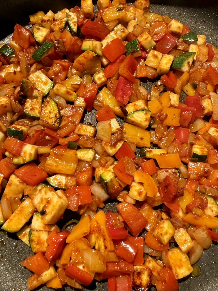 Next, add firm vegetables such as peppers and courgettes, which are cut into pieces approximately 1 cm in size. Also add the salça to the pan and sauté the vegetables for about 3 minutes…