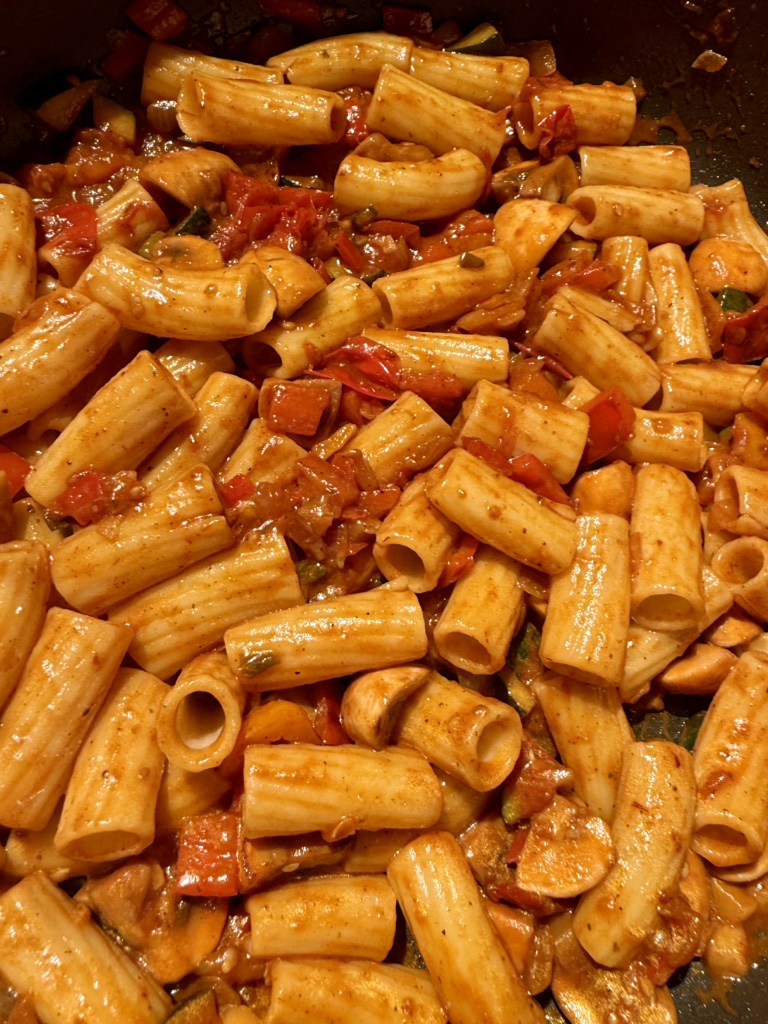 Season the sauce to taste and stir in the noodles. Turn off the heat so that they don’t continue cooking and become too soft, but leave them for at least 2 minutes to absorb the flavour of the vegetables.