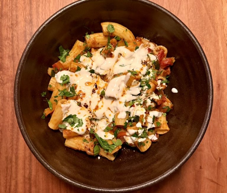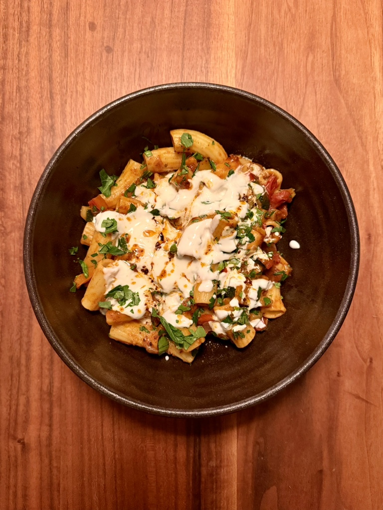 This Turkish dish combines hot noodles with cool garlic yoghurt and chilli butter. Other ingredients include ground beef or Turkish garlic sausage (sucuk) and all kinds of vegetables. However, what you see online and on un-social media these days when you search for this dish is basically always the same: the classic accompaniment for Turkish filled pasta (mantı) – garlic yoghurt and chilli butter – simply dumped over some pasta and that’s it. This is then touted as a ‘hack’, but it’s utter nonsense and pushes aside the whole spectrum of yoğurtlu makarna, as it’s prepared in Turkey.