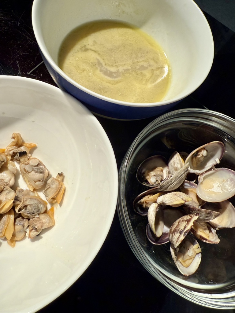 Wenn man Muscheln verwendet, werden diese zunächst mit Wasser abgebraust und dann für 30 – 60 Minuten in leicht gesalzenes Wasser gelegt, damit etwaiger Sand ausgewaschen wird. Zerbrochene Exemplare müssen weggeworfen werden. Hier haben wir das am Beispiel von Spaghetti alle vongole näher erklärt.