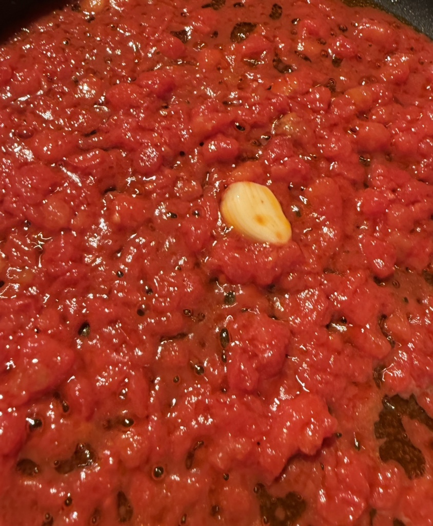 In einer großen Pfanne wird erneut eine geschälte, ganze Knoblauchzehe in Olivenöl auf mittelhoher Stufe erhitzt. Nach 2 Minuten kommen gehackte Tomaten aus der Dose hinzu. Anders als in einigen Rezepten verwenden wir an dieser Stelle keine Zwiebeln und auch keinen gehackten Knoblauch, denn wir wollen nicht von dem Geschmack des Meeres ablenken.