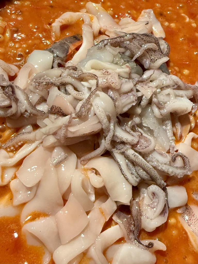 Nach der Hälfte der Zeit, etwa nach ca. 7 Minuten, fügen wir Calamaretti und Gamberetti hinzu. Beides gart rasch.