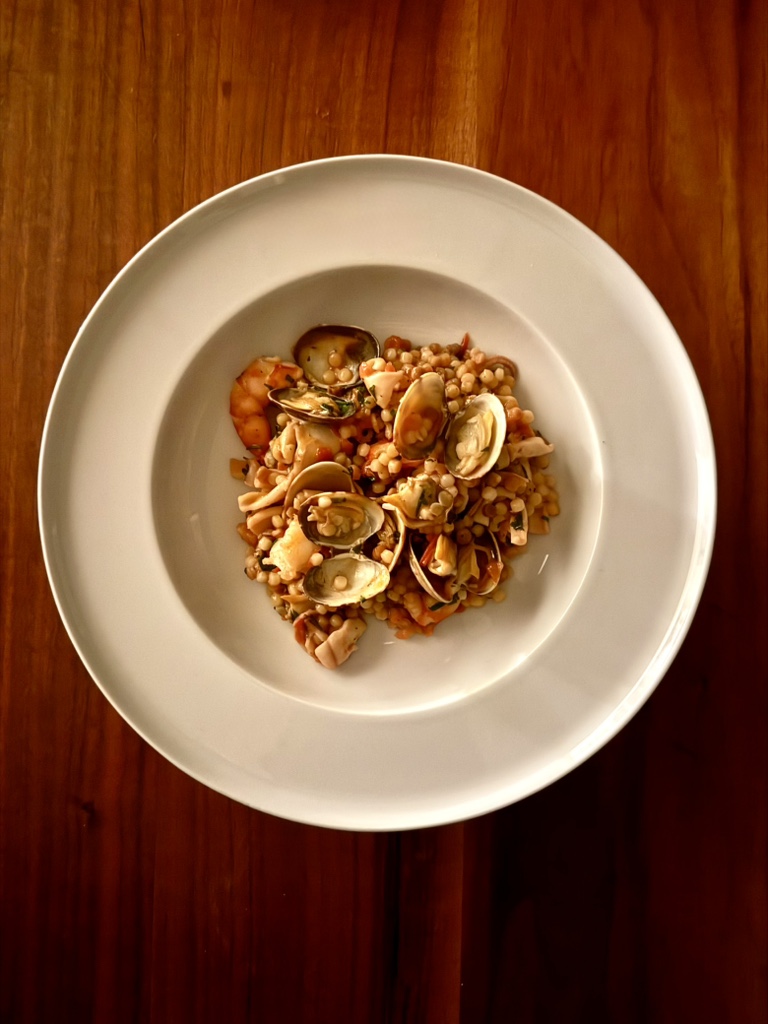 Wenn die Fregola fast gar sind, würzen wir mit schwarzem Pfeffer aus der Mühle und Salz. Dann erst geben wir die vorgegarten Muscheln und etwas gehackte Petersilie in die Pfanne, beides muss nicht mehr gekocht werden.