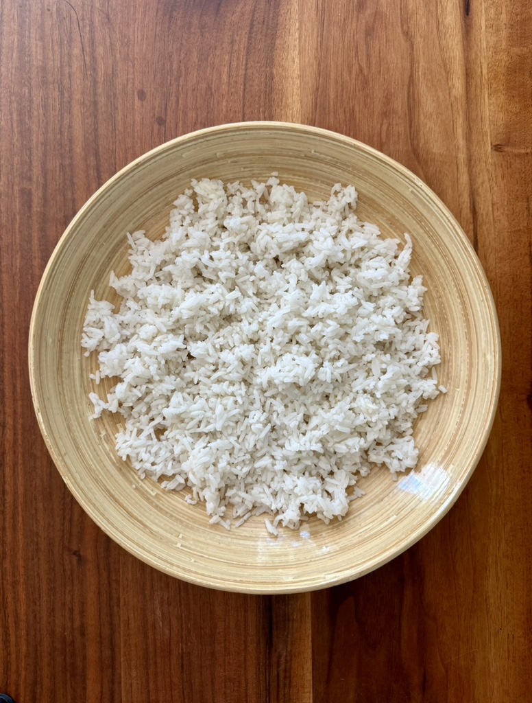 Kein Fried Rice ohne Reis, und hier beginnt die Kontroverse. Nein, es muss nicht zwingend Reis vom Vortag sein, das geht sehr wohl auch anders und das werden wir noch an anderer Stelle erklären. Der unbestreitbare Vorteil von Reis vom Vortag ist aber, dass er trockener ist. Hohe Feuchtigkeit ist natürlich nicht Freund des trockenen Bratens, um das es hier geht. Für Beginner ist daher Reis vom Vortag schon einmal eine sehr gute Idee. Breitet den gekochten Reis am bestens flach auf einem Teller oder Blech aus und lagert ihn so über Nacht im Kühlschrank, was weitere Flüssigkeit entzieht. Teilt die Reiskörner, die natürlich sehr klebrig sind, so mit den Fingern, dass keine größeren Klumpen mehr vorhanden sind.