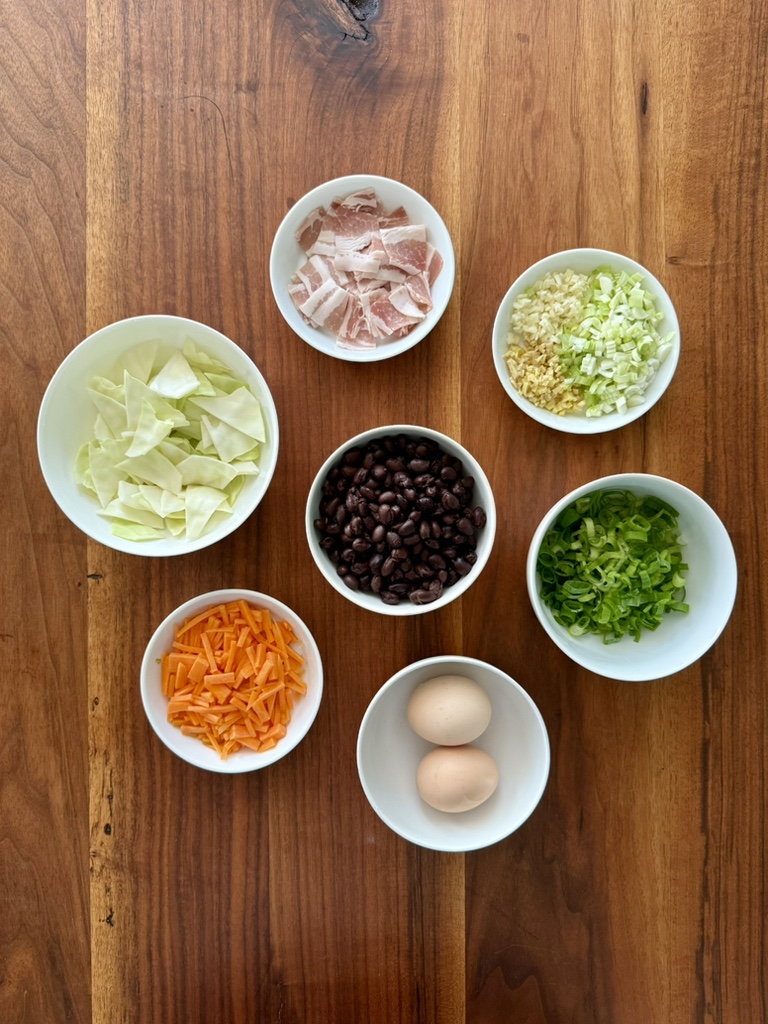 Bauchspeck ist dort obligatorisch – wer das nicht essen möchte, lässt ihn weg und verwendet beispielsweise (getrocknete und rehydrierte) Pilze. Weitere zwingende Zutaten sind Weißkohl oder Chinakohl sowie (schwarze) Bohnen. Wer die nicht bekommt, kann Kidneybohnen verwenden und wer die Bohnen nicht selber kocht, kann Ware aus der Dose nehmen, die ist keineswegs schlecht und enthält in der Regel nur das Produkt, Wasser und Salz. Wir hacken dazu reichlich Knoblauch, Ingwer und das Weiße von Frühlingszwiebeln klein, das Grüne der Frühlingszwiebeln schneiden wir separat in Ringe. Außerdem mögen wir in feine Streifen geschnittene Karotten und pro Person ein Ei, aber das ist optional.