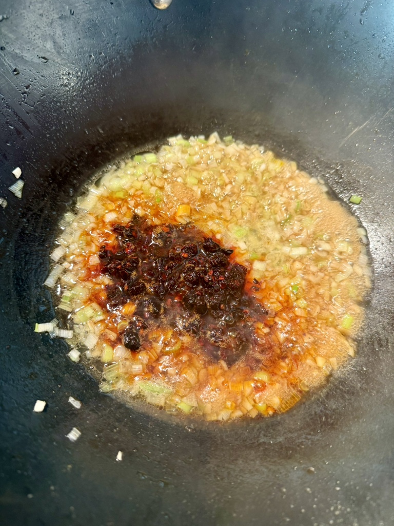 Wenn nach etwa einer Minute alles intensiv duftet, wird weiterer Shaoxing sowie Lao Gan Ma und ein klein wenig Sojasauce hinzugegeben.